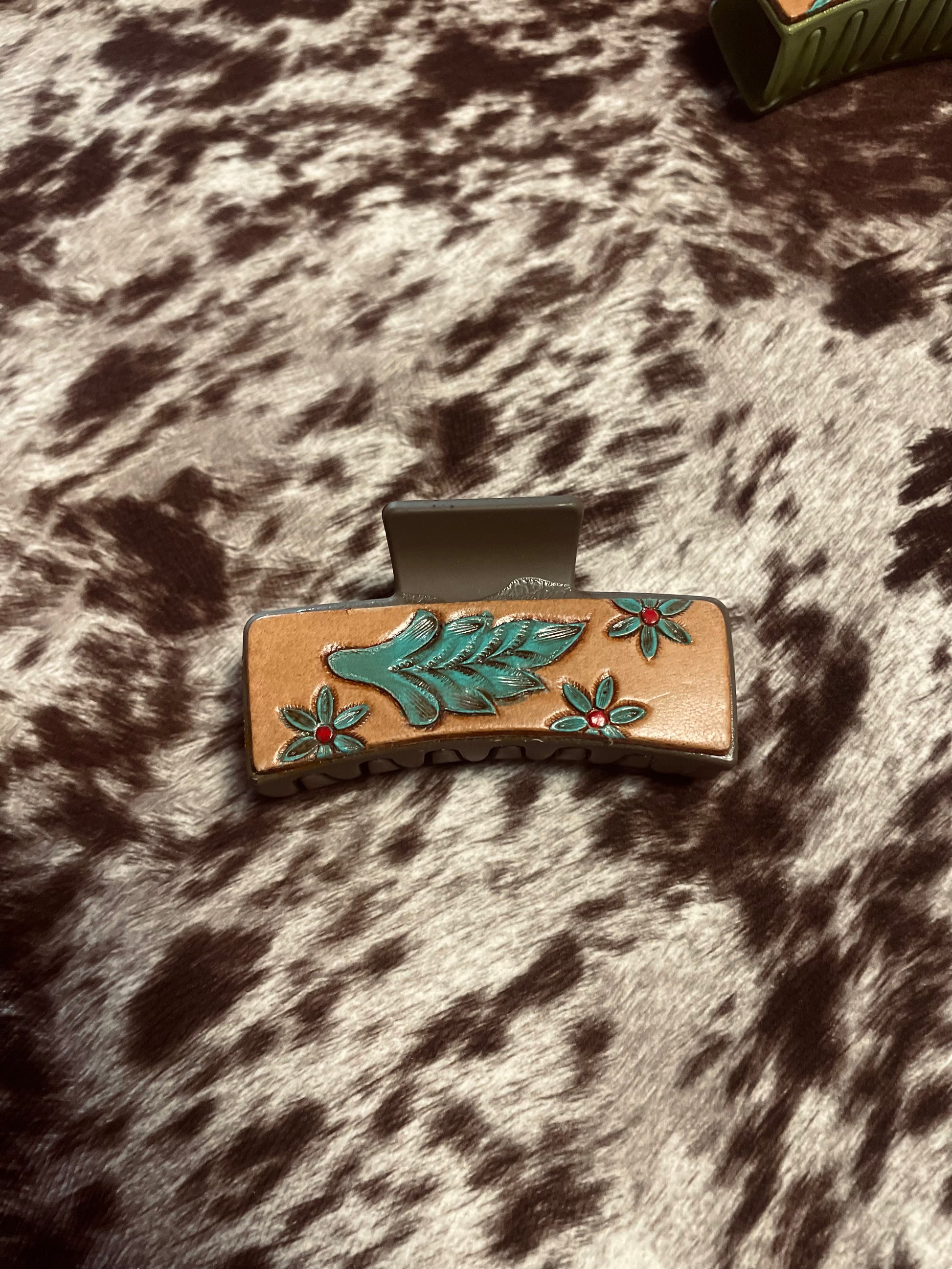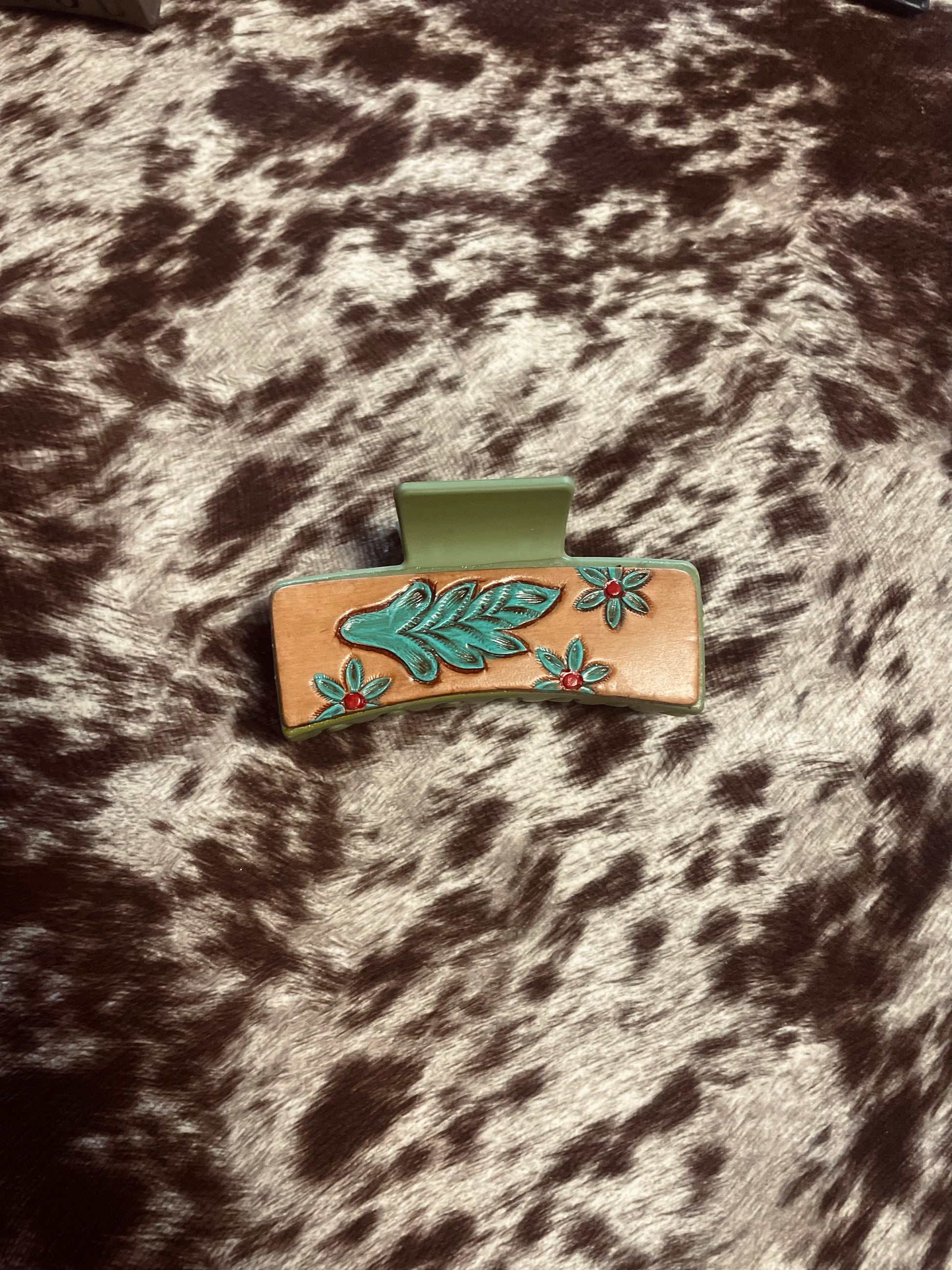 Add a touch of rustic elegance to your look with our Tooled Hair Clip. Handcrafted from premium leather, this clip features a beautifully detailed tooled design that captures the essence of western style. Perfect for securing your hair while adding a unique accent, it's a versatile accessory that complements any outfit, whether you're dressing up for an event or adding flair to your everyday style. Durable and stylish, this hair clip is a must-have for any western accessory collection.