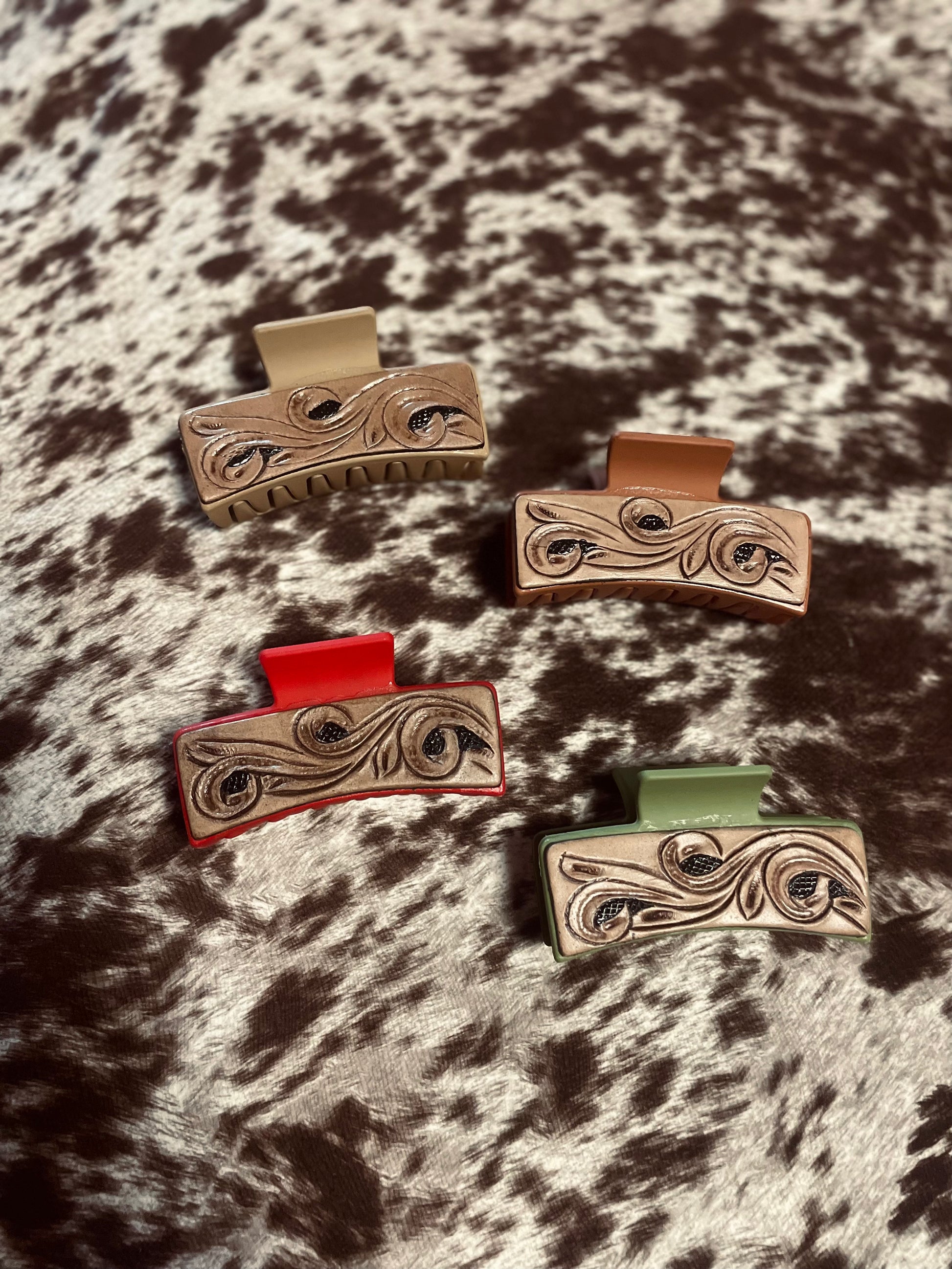 Add a touch of rustic elegance to your look with our Tooled Hair Clip. Handcrafted from premium leather, this clip features a beautifully detailed tooled design that captures the essence of western style. Perfect for securing your hair while adding a unique accent, it's a versatile accessory that complements any outfit, whether you're dressing up for an event or adding flair to your everyday style. Durable and stylish, this hair clip is a must-have for any western accessory collection.